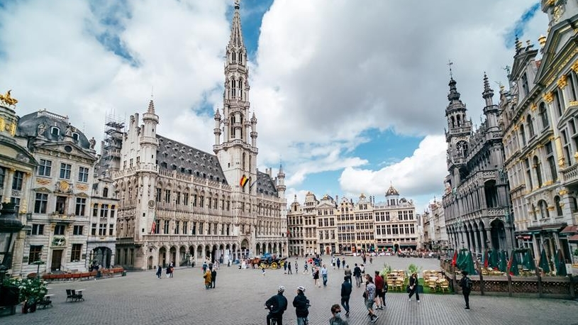 6月28日,兩名來自英國的游客在比利時(shí)布魯塞爾大廣場游覽。