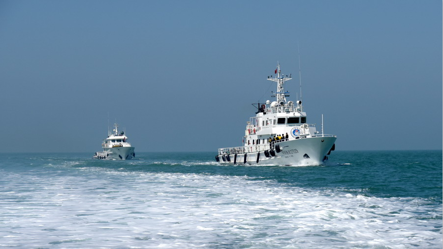 2020年5月6日,山東省榮成市漁政執(zhí)法船在石島灣海域常態(tài)化巡查,場面壯觀如電影大片。