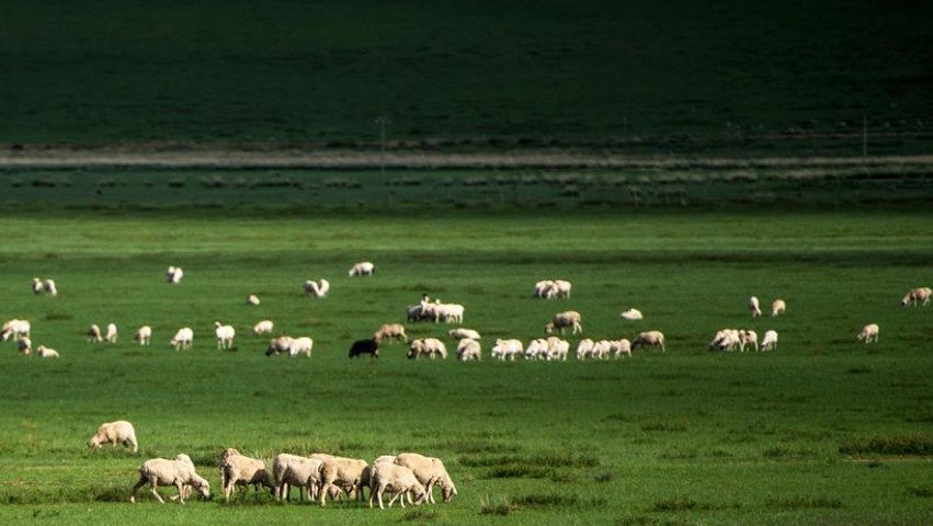 7月18日,羊群在內(nèi)蒙古錫林郭勒盟正鑲白旗境內(nèi)的草原上覓食。