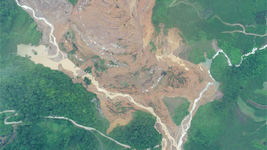 7月17日,一名地質(zhì)勘查人員在湖南省石門縣南北鎮(zhèn)潘坪村雷家山滑坡現(xiàn)場(chǎng)查看災(zāi)情。