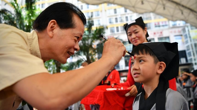 ??诤嬌賰核囆g中心為500名小朋友舉行“開筆禮”,通過“點朱砂,啟智慧”“習書法,描人字”等儀式讓孩子們體驗中國傳統(tǒng)文化。