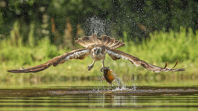魚鷹快速俯沖而下,掠過水面,鷹爪隨即從水中成功抓起一條魚兒,濺起水花,整個過程精彩詮釋快準狠。
