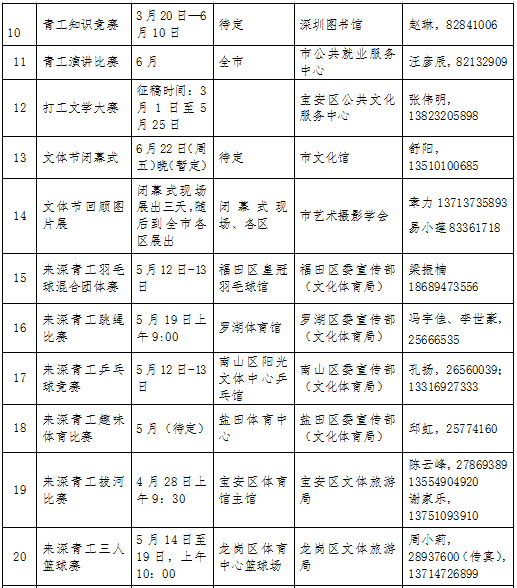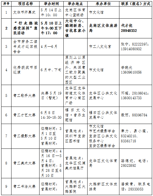 此外,在文體節(jié)期間,全市各級文化、體育部門還將廣泛開展豐富多彩的文藝演出、比賽、展覽、聯(lián)誼、趣味體育、送書送戲送電影到工廠等活動,豐富文體節(jié)的內(nèi)容,滿足廣大來深青工的文體生活需求。目前,全市勞務(wù)工讀書成才巡回報告會、青工美術(shù)大賽已于本月啟動將持續(xù)至6月,來深青工拔河比賽則將于4月28日在寶安體育館開賽。