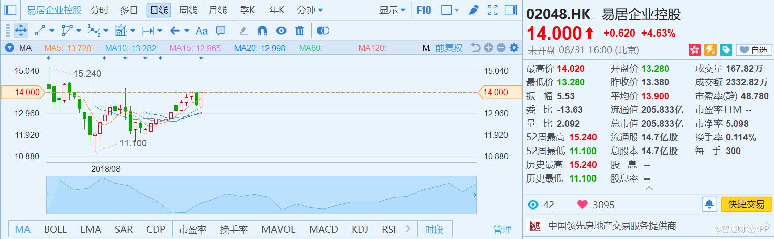 中國房地產(chǎn)行業(yè)正站在拐點上,行業(yè)集中度將進一步提升,存量市場成為各路資本的新戰(zhàn)場,“服務(wù)生”易居在資源及戰(zhàn)略布局上已做好充分準(zhǔn)備,上半年的成績或許只是新的起點。8月31日,易居股價收漲4.63%,報14港元。