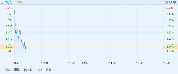 截至11時(shí)17分,濰柴動(dòng)力(02338)跌4.14%,報(bào)價(jià)8.26港元,成交額9590.57萬(wàn)。(王岳川)