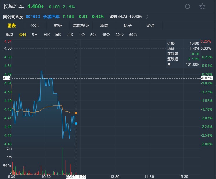 截至發(fā)稿,長(zhǎng)城汽車報(bào)4.46港元,跌2.19%。(文文)