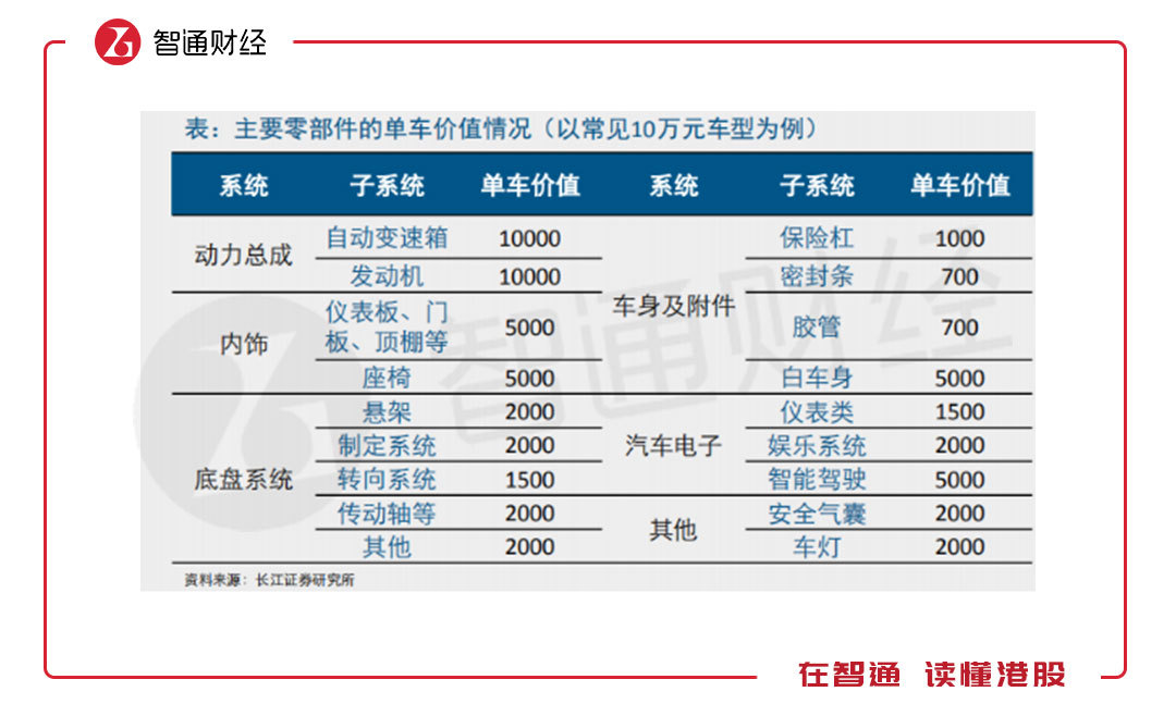 先看燃油車,按照長江證券的研究,以10萬元車型為例,各系統(tǒng)價值合計5.58萬元,動力總成占了35.8%,內(nèi)飾及汽車電子占33%,底盤占17%,車身及附件占13.3%。