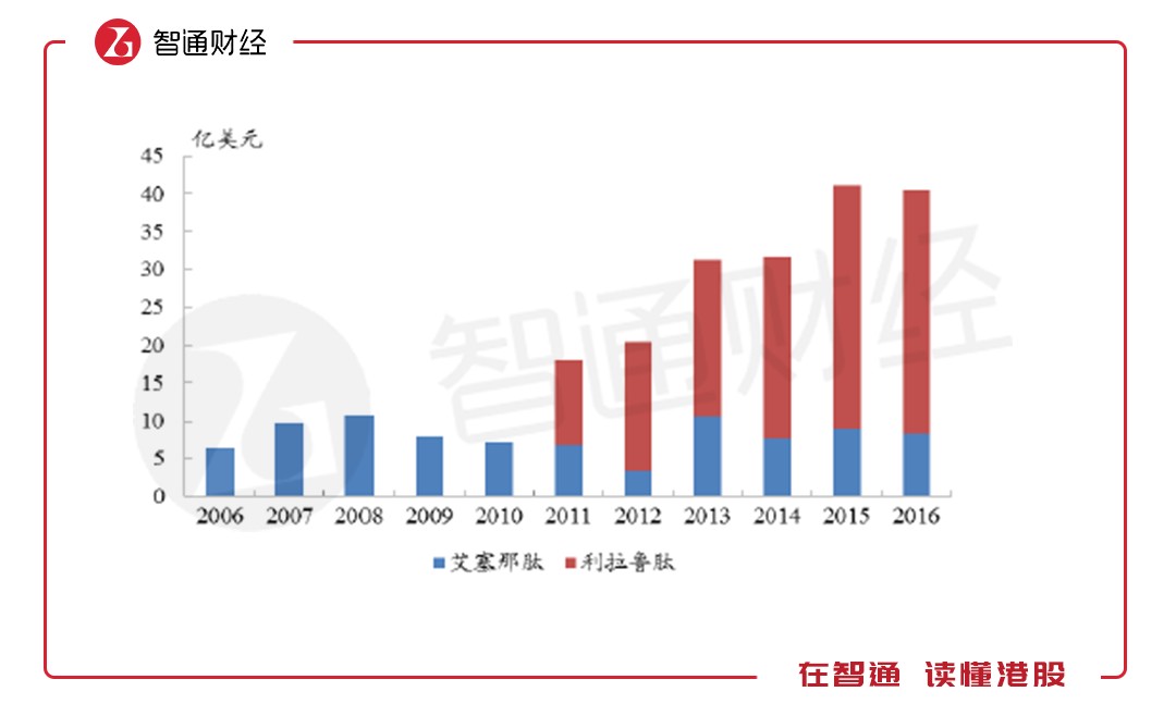 從2005年發(fā)展至今,全球已有6種GLP-1受體激動(dòng)劑相繼獲批上市,整個(gè)GLP-1受體激動(dòng)劑類藥物的全球市場(chǎng)規(guī)模已超過40億美元,2011-2016年的復(fù)合增長率超過15%。而艾塞那肽作為最早上市的GLP-1類似物,上市后銷售額快速增長,早在2008年就突破10億美元。