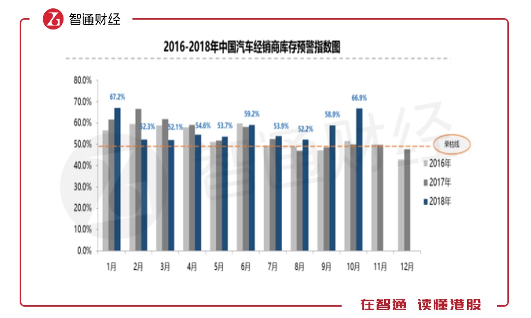 實(shí)際上,從汽車制造到最終消費(fèi)者,流通過程要通過經(jīng)銷商,中汽協(xié)近日公布了經(jīng)銷商庫存預(yù)警指數(shù),顯示下半年以來,庫存預(yù)警指數(shù)均高于前兩年,10月份創(chuàng)出新高,預(yù)警指數(shù)達(dá)66.9%,而榮枯線為50%,汽車庫存堪憂,未來兩個(gè)月消化難度依然很大。