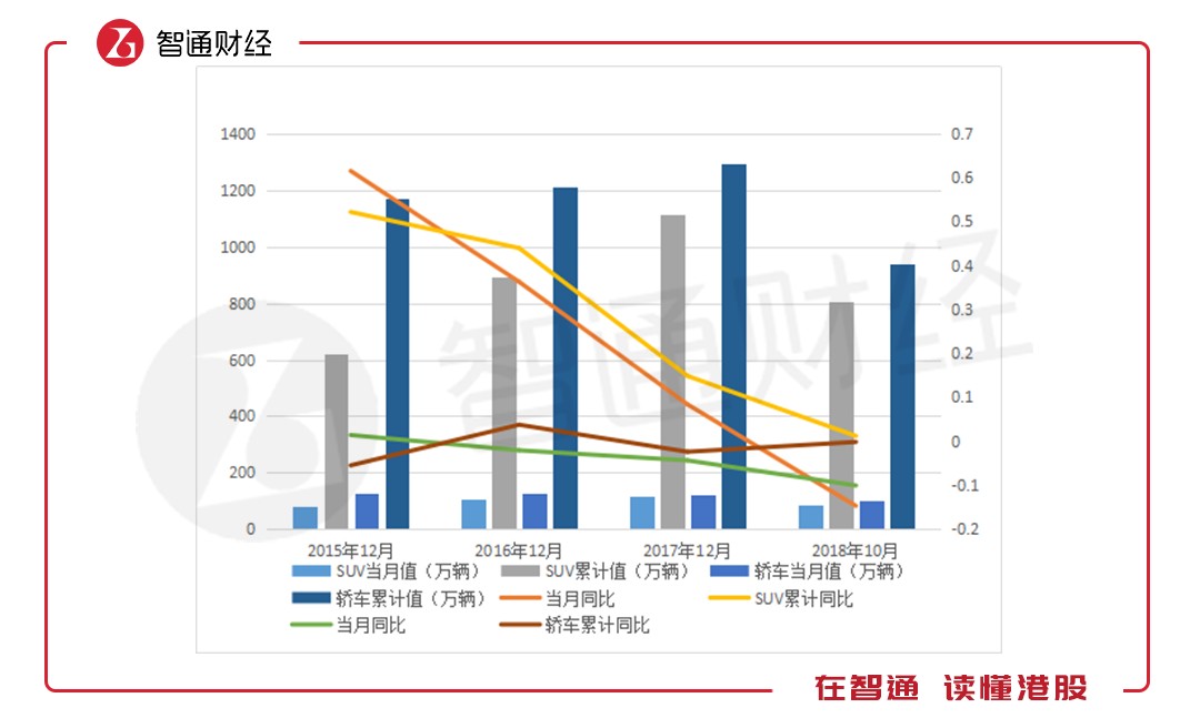 轎車和SUV車型在2018年首10月銷量合計(jì)約1749萬輛,分別占據(jù)了汽車以及乘用車76.5%和90.6%的份額,這兩類車型的消費(fèi)表現(xiàn)代表了整個(gè)汽車以及乘用車行業(yè)的景氣情況。