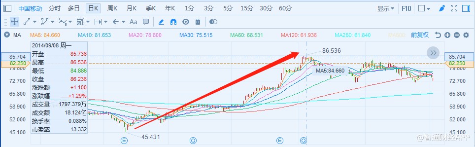 2013年12月4日,工業(yè)和信息化部正式向三大運(yùn)營(yíng)商發(fā)放了4G牌照。隨后的2014年,見(jiàn)證了4G前期的陣痛和后期的爆發(fā)。也在這一年,中國(guó)移動(dòng)股價(jià)上漲了21.32%。