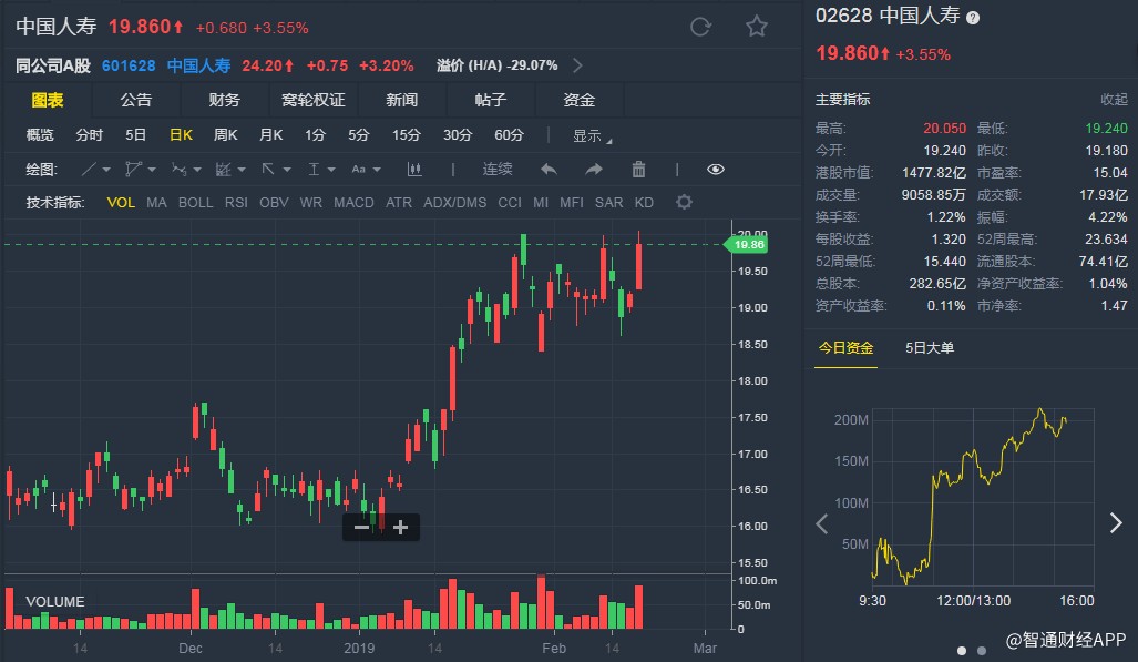 截至發(fā)稿,中國(guó)人壽(02628)升3.55%,報(bào)19.86港元。(劉大洋)