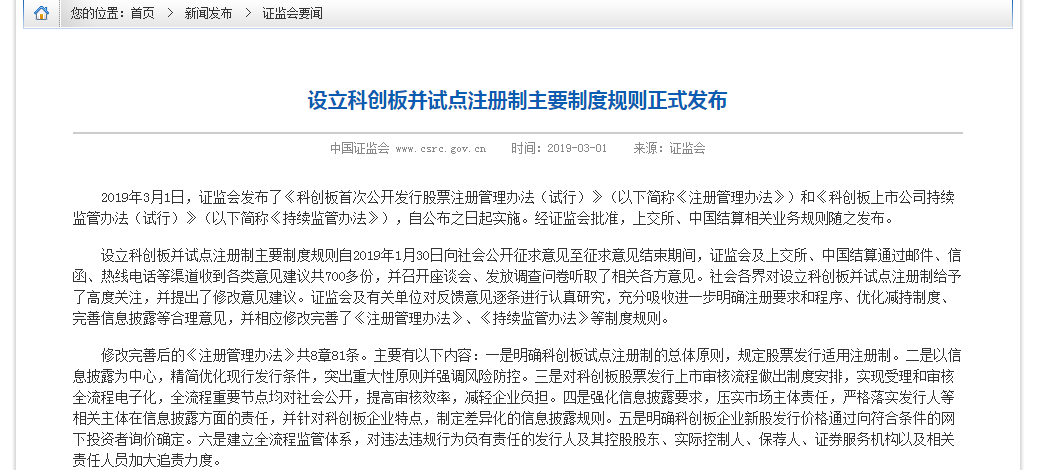 3月1日晚間,中國證監(jiān)會、上海證券交易所正式發(fā)布設(shè)立科創(chuàng)板并試點(diǎn)注冊制的主要制度規(guī)則。這表明,經(jīng)過一個月的意見征集,市場高度關(guān)注的科創(chuàng)板正式開閘。要點(diǎn)總結(jié)如下:
