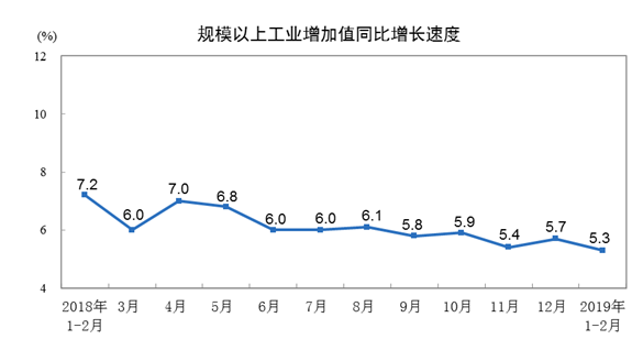 智通財經(jīng)APP獲悉,國家統(tǒng)計局今日公布,2019年1-2月份,規(guī)模以上工業(yè)增加值同比實際增長5.3%(以下增加值增速均為扣除價格因素的實際增長率),預(yù)期增長5.6%,前值為6.2%。據(jù)測算,剔除春節(jié)因素影響增長6.1%。從環(huán)比看,2月份,規(guī)模以上工業(yè)增加值比上月增長0.43%。