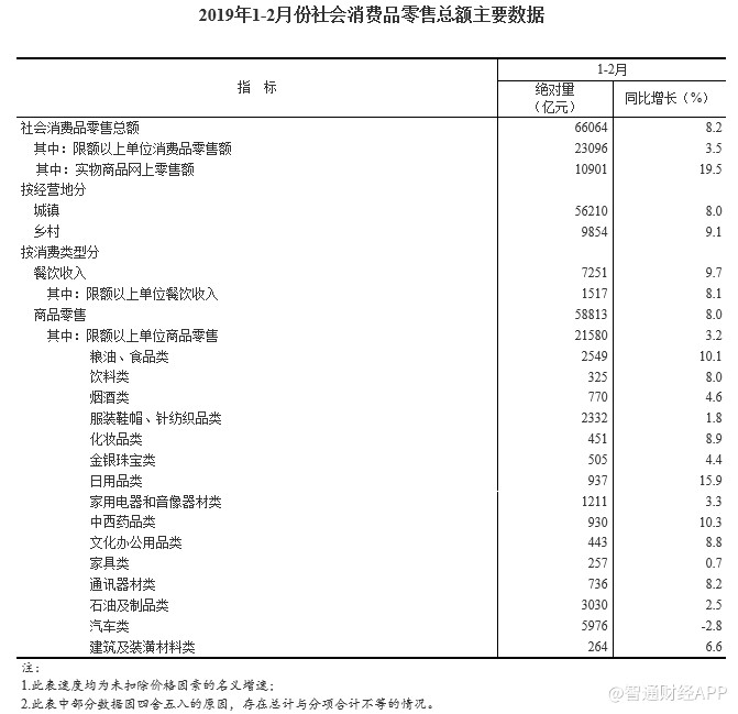 智通財經(jīng)APP獲悉,國家統(tǒng)計(jì)局公布,2019年1-2月份,社會消費(fèi)品零售總額66064億元,同比名義增長8.2%,符合預(yù)期,但低于前值增長9%。其中,限額以上單位消費(fèi)品零售額23096億元,增長3.5%。