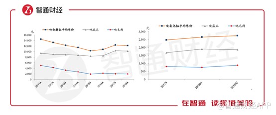 二是因?yàn)槠洚a(chǎn)品噸成本居高不下,拿電解鋁來(lái)說(shuō),2015年之前,隨著售價(jià)的明顯下降,噸成本卻保持穩(wěn)定,導(dǎo)致利潤(rùn)空間被壓縮。新生產(chǎn)品氧化鋁毛利率目前還比較穩(wěn)定,并且高于電解鋁的毛利率。這可能也是氧化鋁業(yè)務(wù)占比迅速擴(kuò)大的原因。
