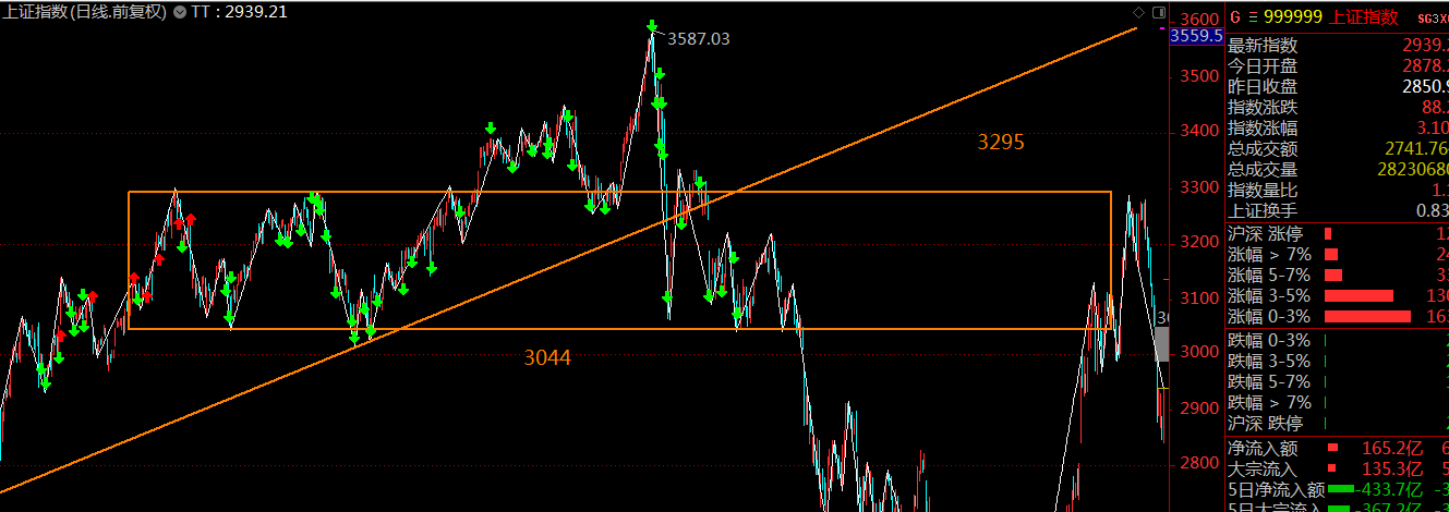 上證指數(shù)日K線看,缺口跌破了日K中樞的下軌,這里會對反彈產(chǎn)生較大壓力,關(guān)注3044點的反壓。