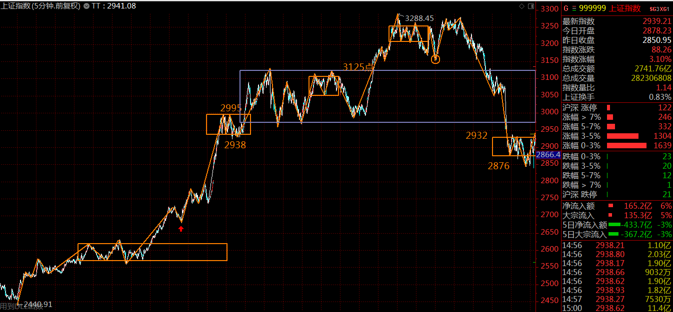 再看5分鐘級別走勢結(jié)構(gòu),在特朗普的幫助下,這里直接跌穿了三月份構(gòu)建的三十分鐘級別中樞,力度較大。周五逆轉(zhuǎn)趨勢后,在三十分鐘中樞下面,完成了這段下跌趨勢第二個五分鐘中樞的構(gòu)建工作。大概率宣告了這段五分鐘下跌趨勢的終結(jié)。下周一、周二,上證指數(shù)面臨了上方30分鐘中樞下軌2968點的反壓,可能會出現(xiàn)回落,投資者可逢低吸納。