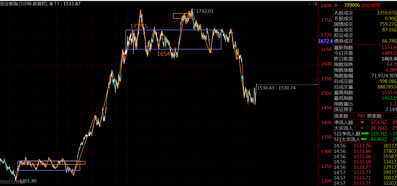 創(chuàng)業(yè)板這里走勢結(jié)構(gòu)粗暴直接的多,目前已遠離上方的三十分鐘中樞,壓力位在上方中樞下沿1616點附近,空間較大。相對來說,短期小票走勢可能會強一些。
