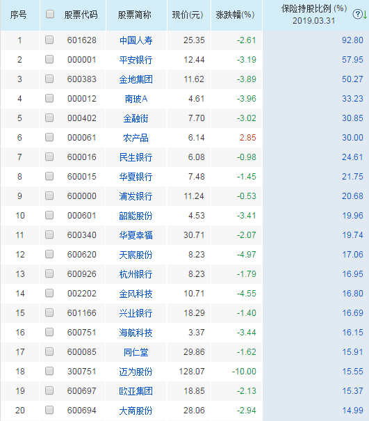 險資持股比例大于15%的個股名單如下: