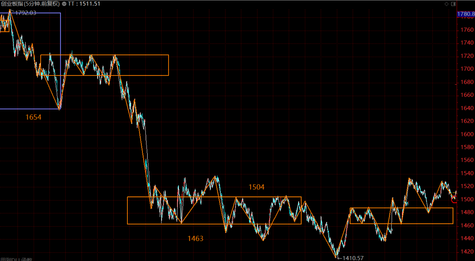 創(chuàng)業(yè)板這里未拉離最后一個30分鐘中樞(1463-1504),在中樞上軌附近橫盤,這里做同級別分解后,紅圈圈位置為五分鐘級別的第三類買點。因此,綜合兩個股指,周初市場上漲,后半段需轉(zhuǎn)入防守,逐步縮減倉位,以應(yīng)對回調(diào)。