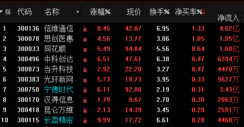 創(chuàng)業(yè)板50成分股周四資金凈流入前10公司:
