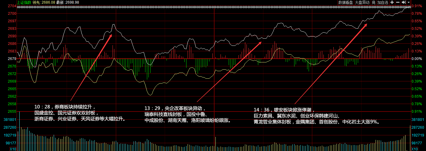 兩市開盤漲跌不一,創(chuàng)業(yè)板明顯弱于主板,ST板塊偃旗息鼓,券商、地產等板塊走強帶動滬指上行。午后指數震蕩走高,雄安新區(qū)尾盤掀起漲停潮,滬指連漲三日重返2700點。