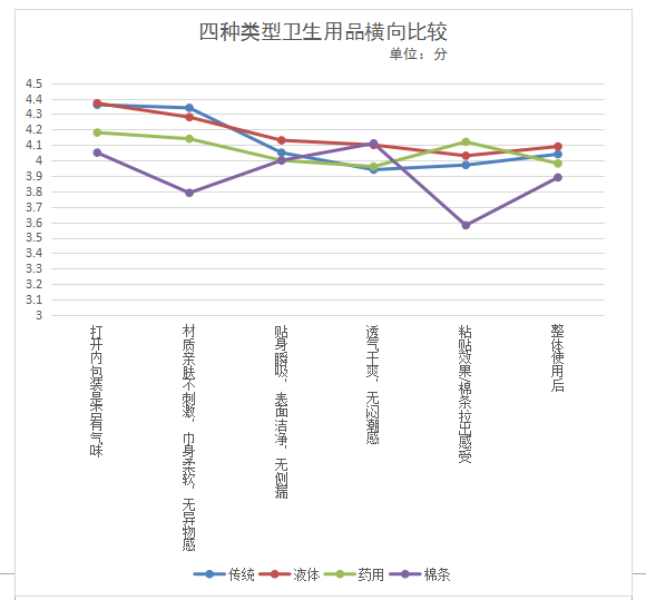 本次衛(wèi)生巾比較試驗共招募150名目前沒有從事有關(guān)衛(wèi)生巾行業(yè)的年齡介于16-45歲之間的消費者分別對傳統(tǒng)型衛(wèi)生巾、新型衛(wèi)生巾(液體材料衛(wèi)生巾)、衛(wèi)生棉條、功能性(藥用)衛(wèi)生巾四種類型商品進行體驗。要求體驗消費者對所使用的衛(wèi)生用品進行1-5分的評價(1分最低,5分最高),主要體驗內(nèi)容及感受如下: