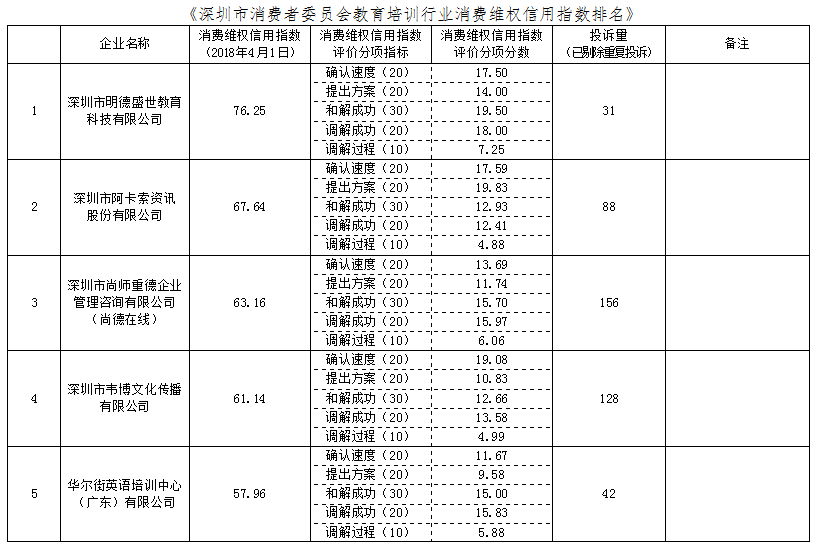 附:《深圳市消費(fèi)者委員會(huì)教育培訓(xùn)行業(yè)消費(fèi)維權(quán)信用指數(shù)排名》