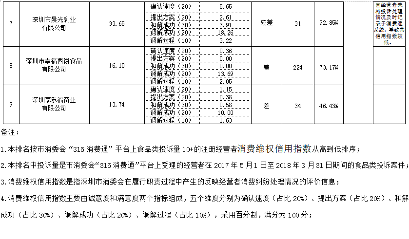 一、深圳市食品行業(yè)消費維權(quán)信用指數(shù)排行榜