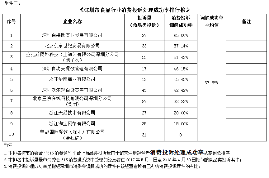 附件二:《深圳市食品行業(yè)企業(yè)消費投訴處理成功率排行榜》