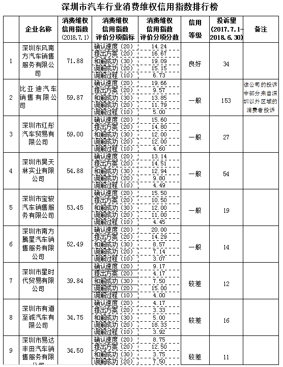 數(shù)據(jù)顯示,在49家企業(yè)中排名前三的企業(yè)分別是:深圳東風(fēng)南方汽車銷售服務(wù)有限公司,消費(fèi)維權(quán)信用指數(shù)71.88,信用等級(jí)良好;比亞迪汽車銷售有限公司,消費(fèi)維權(quán)信用指數(shù)59.87,信用等級(jí)一般;深圳市紅彤汽車貿(mào)易有限公司,消費(fèi)維權(quán)信用指數(shù)59.00,信用等級(jí)一般。比亞迪汽車銷售有限公司因經(jīng)銷商遍布各地,故有部分深圳以外區(qū)域的消費(fèi)者投訴。本次排名后三的企業(yè)是:深圳市標(biāo)域汽車有限公司,消費(fèi)維權(quán)信用指數(shù)3.29,信用等級(jí)差;深圳標(biāo)特汽車(集團(tuán))有限公司,消費(fèi)維權(quán)信用指數(shù)2.45,信用等級(jí)差;深圳市宏創(chuàng)陸風(fēng)汽車銷售有限公司,消費(fèi)維權(quán)信用指數(shù)0,信用等級(jí)差,排名最后。