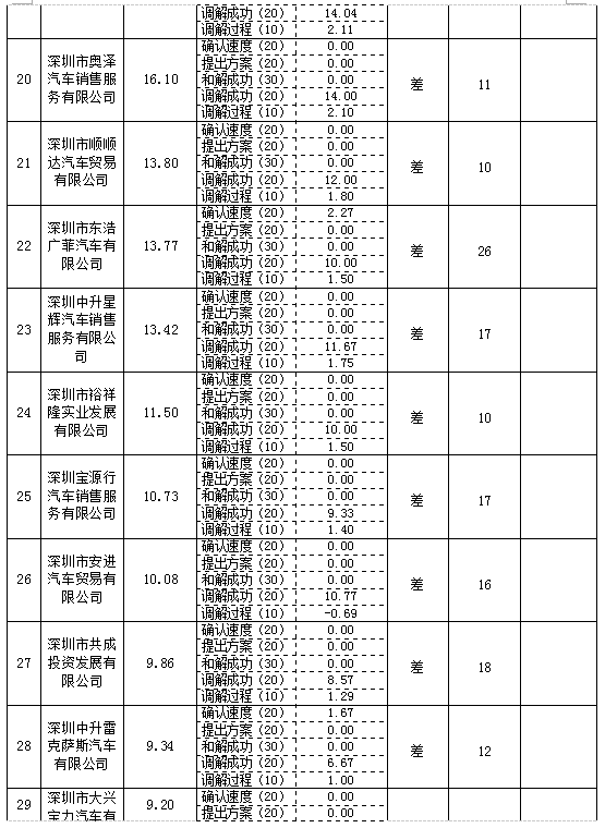 在細(xì)分指標(biāo)方面,深圳市標(biāo)域汽車有限公司、深圳標(biāo)特汽車(集團(tuán))有限公司和深圳市宏創(chuàng)陸風(fēng)汽車銷售有限公司等27家企業(yè)處理投訴不及時(shí),未積極與消費(fèi)者先行和解,導(dǎo)致其企業(yè)“確認(rèn)速度”、“提出方案”和“和解成功”三項(xiàng)分項(xiàng)指標(biāo)的分?jǐn)?shù)皆為0,嚴(yán)重影響了企業(yè)的消費(fèi)維權(quán)信用指數(shù)和信用等級(jí)。深圳市仁孚特力汽車服務(wù)有限公司、深圳市安進(jìn)汽車貿(mào)易有限公司和深圳市大興寶譽(yù)汽車銷售服務(wù)有限公司在由消委會(huì)工作人員評(píng)分的“調(diào)解過(guò)程”分項(xiàng)指標(biāo)分?jǐn)?shù)為負(fù)分,3家企業(yè)存在不配合調(diào)解甚至拒絕調(diào)解的情況,解決消費(fèi)糾紛的誠(chéng)意度較差;另外,深圳市宏創(chuàng)陸風(fēng)汽車銷售有限公司的消費(fèi)維權(quán)信用指數(shù)為0,誠(chéng)意度和滿意度為0,10宗消費(fèi)投訴皆未處理成功,排名最后。