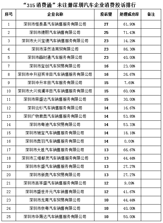 此外,為了全面展示深圳市汽車行業(yè)消費(fèi)投訴狀況,深圳消委會同時公布《“315消費(fèi)通”未注冊深圳汽車企業(yè)消費(fèi)投訴排行》。