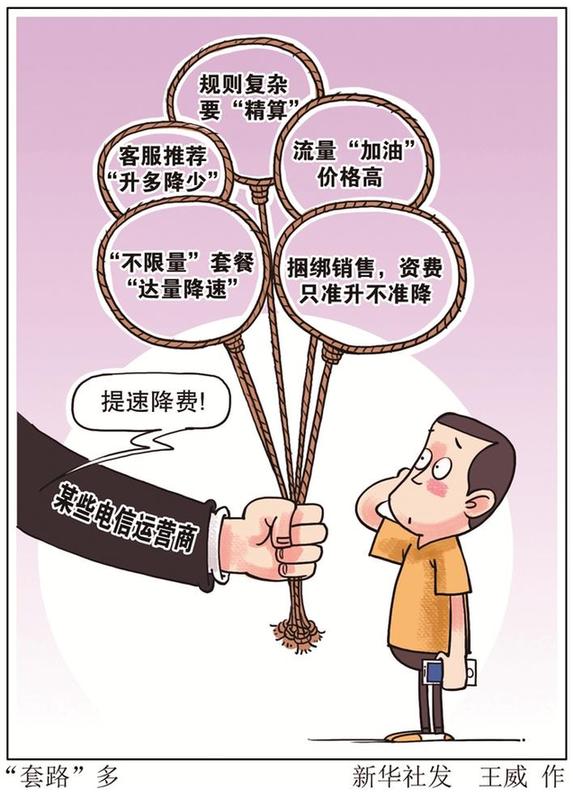 套路五:捆綁銷售,資費(fèi)只準(zhǔn)升不準(zhǔn)降。許多消費(fèi)者在辦理手機(jī)套餐時(shí),運(yùn)營(yíng)商會(huì)贈(zèng)送寬帶服務(wù),二者資費(fèi)不能單獨(dú)改動(dòng)。深圳王女士去年辦理了某運(yùn)營(yíng)商的“136元贈(zèng)送寬帶”的電信套餐,但套餐內(nèi)流量只有1GB,且不能更換成其他流量資費(fèi)優(yōu)惠的套餐;如果超流量就必須支付30元1GB的“流量包”。王女士每月實(shí)際通訊費(fèi)超過170元。