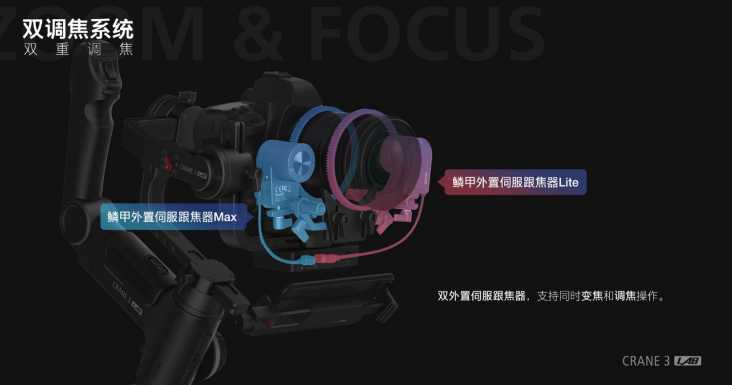 云鶴3 LAB可搭載雙外置伺服跟焦器,支持變焦和跟焦同時(shí)操作。傳統(tǒng)電子跟焦精度低,延遲高,只能兼容特定品牌的相機(jī)加鏡頭,調(diào)焦不順滑;外置伺服跟焦高精度,無延遲,對(duì)相機(jī)和鏡頭無特殊要求,調(diào)焦順滑。雙外置伺服跟焦高精度,無延遲,對(duì)相機(jī)和鏡頭無特殊要求,跟焦、變焦順滑,支持同時(shí)操作。既可以通過機(jī)器上的跟焦手輪和船型按鍵控制調(diào)焦和變焦,也可以通過ViaTouch在手機(jī)屏幕上直接控制調(diào)焦和變焦。