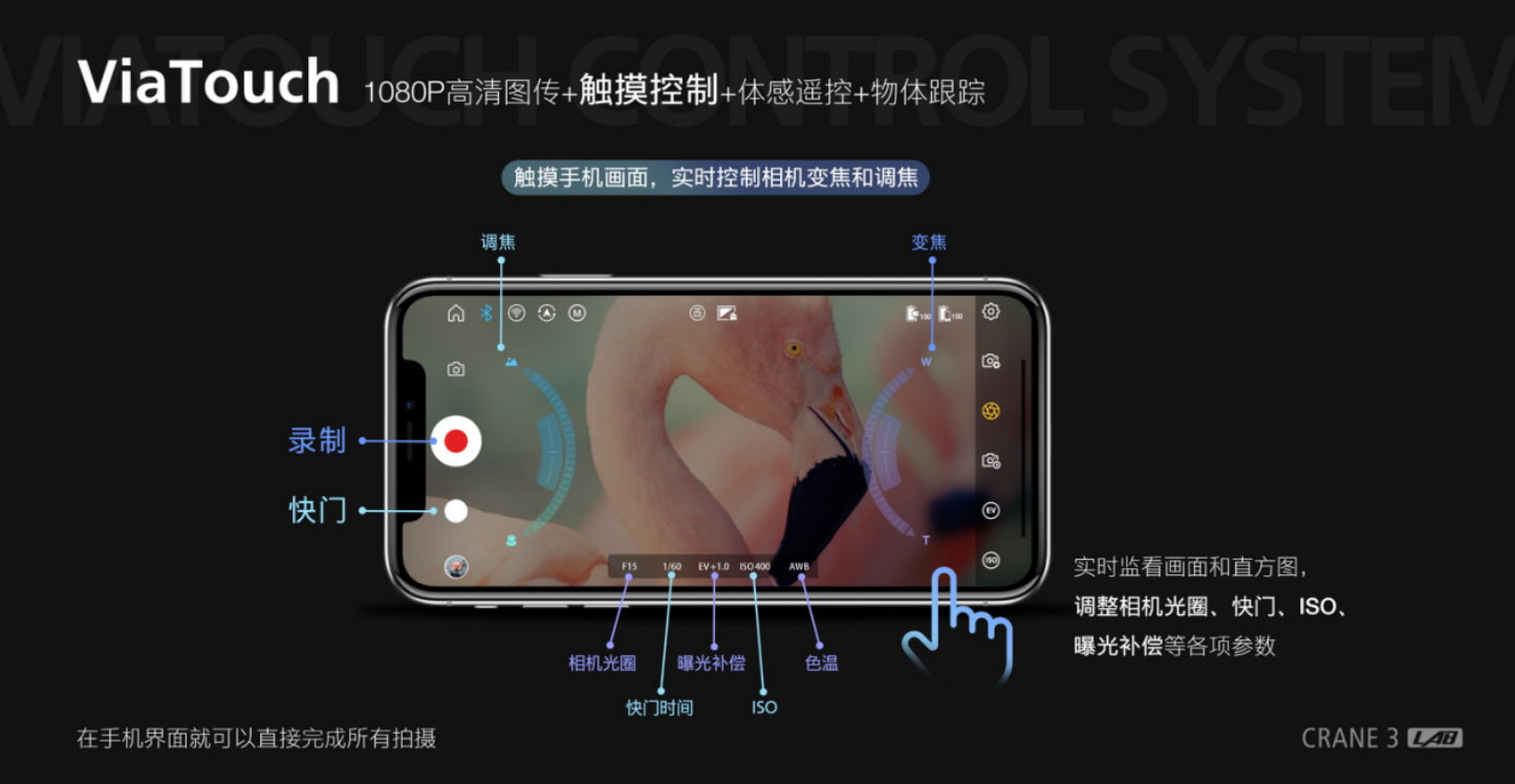 全新的ViaTouch交互功能:云鶴3 LAB搭載旗艦無線圖傳系統(tǒng),最高支持1080P的分辨率,手機(jī)、平板都能成為單反監(jiān)視屏,實(shí)時(shí)監(jiān)看畫面構(gòu)圖和各項(xiàng)參數(shù)。在手機(jī)界面就可以直接完成所有拍攝;還能實(shí)時(shí)監(jiān)看畫面和直方圖,調(diào)整相機(jī)光圈、快門、ISO、曝光補(bǔ)償?shù)雀黜?xiàng)參數(shù)。觸摸手機(jī)畫面,實(shí)時(shí)控制相機(jī)變焦和調(diào)焦。取下作為監(jiān)視器的手機(jī),即可變身成為一臺(tái)體感遙控器,一機(jī)兩用。在手機(jī)中框選住想要追蹤的物體,穩(wěn)定器就會(huì)控制相機(jī)自動(dòng)跟隨物體進(jìn)行拍攝。
