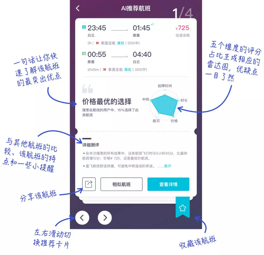 iGola通過AI技術(shù)將傳統(tǒng)的機(jī)票搜索頁面中,數(shù)十條的結(jié)果優(yōu)選為5條,通過測試,5條搜索結(jié)果可以基本cover用戶95%的選擇可能。將價(jià)格時(shí)長航司中轉(zhuǎn)起降時(shí)間,設(shè)置為5個(gè)維度,以五星維度圖的形式對相關(guān)航旅方案進(jìn)行直觀的評(píng)價(jià),并給出明顯的文字提示,闡明航旅方案亮點(diǎn)。定制內(nèi)容-千人千面,不同需求的乘客(重視價(jià)格、重視服務(wù)),會(huì)得到不同的搜索結(jié)果。UI設(shè)計(jì)與傳統(tǒng)的OTA搜索界面有巨大差異,操作極簡,深受年輕用戶喜歡。