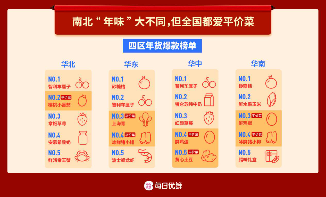 追求年輕化、精品化的華南消費(fèi)者在年貨消費(fèi)上也有精打細(xì)算的一面。在每日優(yōu)鮮的四區(qū)年貨爆款榜單里,平價(jià)親民的鮮水果玉米、鮮雞蛋就被不少華南用戶“加車”,而這些食材的定價(jià),也和春節(jié)期間菜價(jià)波動(dòng)形成了反差。