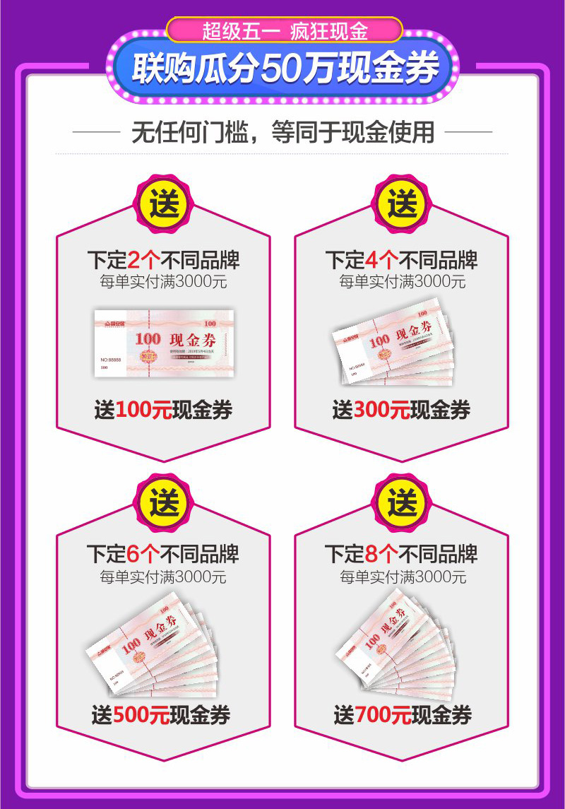 3、聯(lián)購滿額瓜分50萬現(xiàn)金券:5月1日-5月4日活動期間,顧客每單實付3000元,下定2個不同品牌,即送100元現(xiàn)金券,下定4個不同品牌,即送300元現(xiàn)金券,下定6個不同品牌,即送500元現(xiàn)金券,國安居準備了50W現(xiàn)金券,送完即止。
