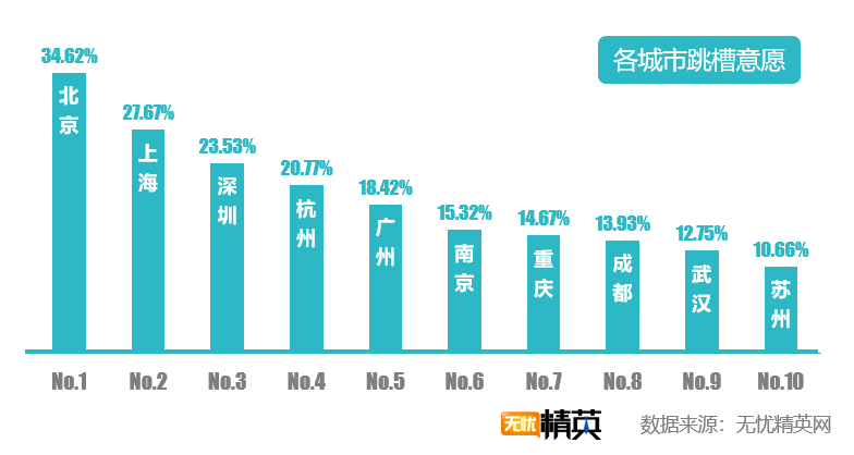 一線城市,擁有相對(duì)較多的就業(yè)機(jī)會(huì),和較大的發(fā)展空間,依然是跳槽意愿最高的地區(qū)。北京的精英們跳槽意愿最高,34.12%的人想跳槽,這也是今年來(lái)唯一一個(gè)跳槽意愿上升的城市。