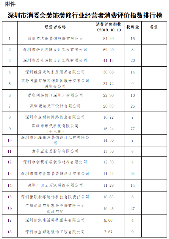 11月20日,深圳市消費(fèi)者委員會(huì)(以下簡(jiǎn)稱“深圳市消委會(huì)”)首次發(fā)布深圳市消委會(huì)裝飾裝修行業(yè)消費(fèi)評(píng)價(jià)指數(shù)排行榜。榜單旨在敦促裝飾裝修行業(yè)經(jīng)營(yíng)者提升商品和服務(wù)質(zhì)量,為消費(fèi)者提供裝飾裝修消費(fèi)指引,營(yíng)造安全放心的消費(fèi)環(huán)境。
