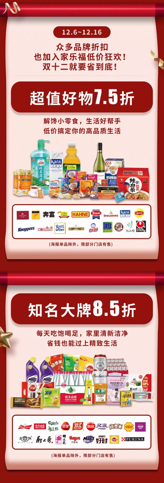 12月6日至16日,奔富、袋鼠、大湖、白貓、立頓、農(nóng)心、伯朗咖啡、憶江南等知名品牌商品,推出限時7.5折。百威、農(nóng)夫山泉、三全、雙匯、億滋、好時、偉嘉等大牌商品,奉上限時8.5折。寶潔系列產(chǎn)品,組合購買,滿減更加優(yōu)惠;聯(lián)合利華系列產(chǎn)品,兩件折扣、勁爆組合價、買一送一歡樂購。