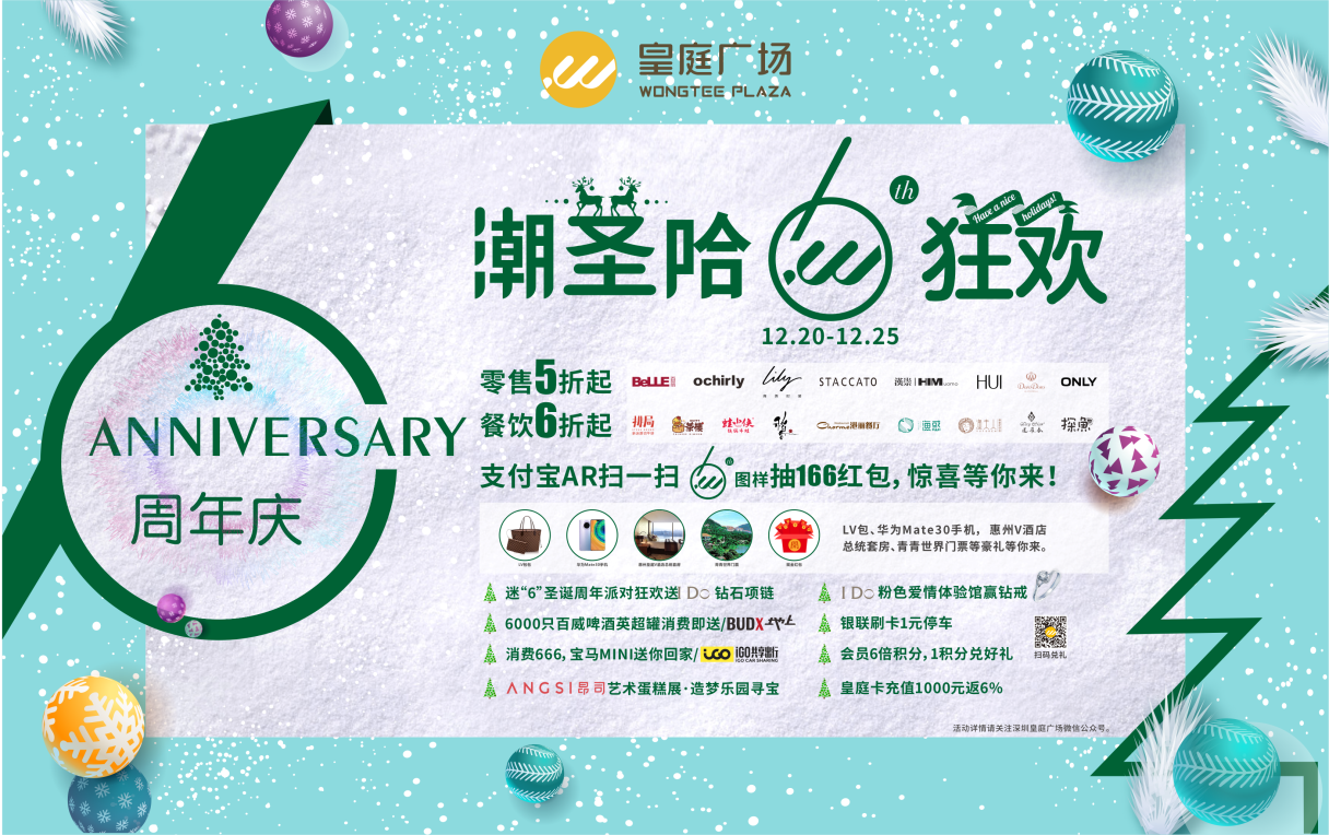 六周年慶期間,深圳皇庭廣場(chǎng)攜手場(chǎng)內(nèi)200余家優(yōu)質(zhì)商戶(hù)、銀聯(lián)等進(jìn)行資源合作,并通過(guò)自有小程序,組合線上引流包,啟動(dòng)支付寶AR掃碼抽L(zhǎng)V、華為手機(jī)、166元現(xiàn)金紅包及商戶(hù)百萬(wàn)代金券驚喜;網(wǎng)紅餐飲、時(shí)尚零售折扣低至冰點(diǎn);更有迷“6”周年派對(duì)狂歡送百萬(wàn)好禮,寶馬MINI送回家等驚喜活動(dòng),期待與你在皇庭的光影空間里拉近距離,一起吃喝玩樂(lè),嗨購(gòu)潮玩,6周年的故事期待有你參與!