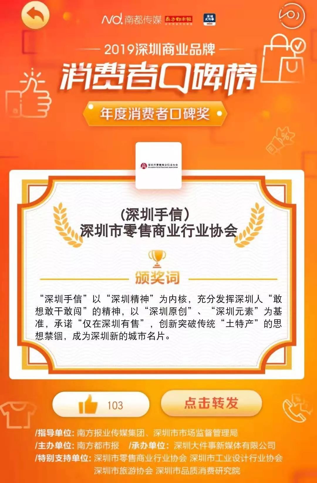 深圳手信作為深圳的城市品牌順利斬獲2019年“深圳商業(yè)品牌·消費(fèi)者口碑榜”【年度口碑大獎(jiǎng)】。作為城市之禮,“深圳手信強(qiáng)調(diào)“深圳精神”創(chuàng)新內(nèi)核,臻選一城好禮,所有產(chǎn)品來自深圳本土優(yōu)秀企業(yè)。