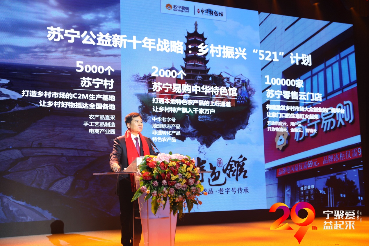就在12月26日舉行的“蘇寧29周年公益慶生儀式暨新十年公益戰(zhàn)略發(fā)布會”上,蘇寧控股集團(tuán)董事長張近東發(fā)布了蘇寧鄉(xiāng)村振興“521計劃”,中華特色館是其中重要部分,未來十年要達(dá)到2000個。同時,蘇寧村將會建設(shè)至5000個,蘇寧易購零售云門店則將要開到10萬家。張近東表示,“521”取自三個目標(biāo)的首個數(shù)字,同時也寄托著著蘇寧幫扶鄉(xiāng)村、振興鄉(xiāng)村的深切感情。