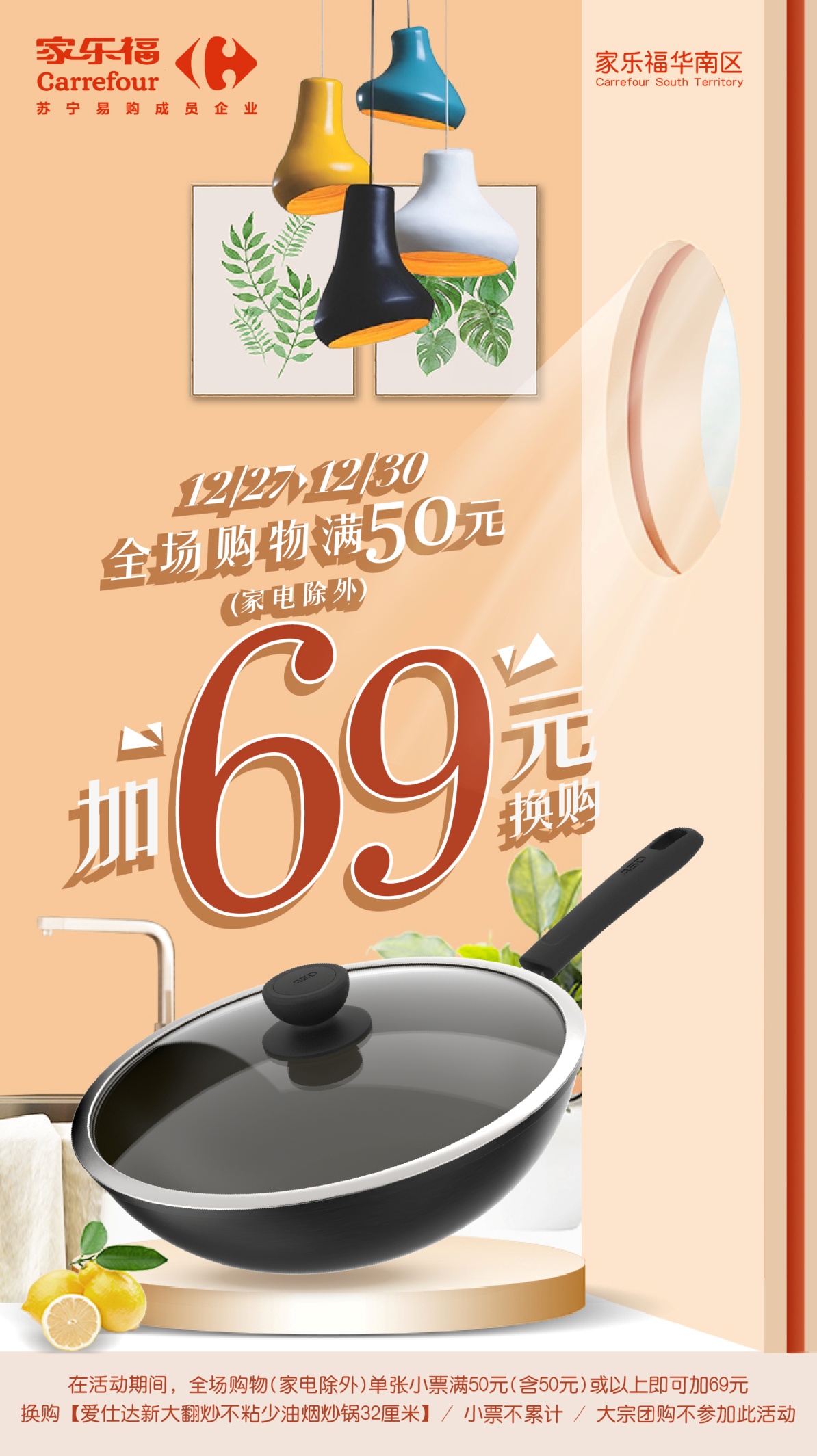 最后播報(bào)一則“筍盤”信息。12月27日至30日,顧客在家樂福華南區(qū)門店全場購物滿50元,還可加69元換購愛仕達(dá)新大翻炒不粘少油煙炒鍋32厘米(家電、大宗團(tuán)購除外,小票不累計(jì))。