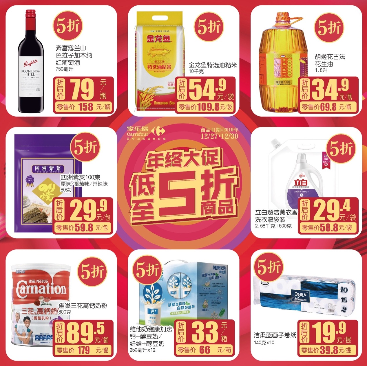 5折雜貨篇:爆款奔富寇蘭山色拉子加本納紅葡萄酒、金龍魚特選油粘米、胡姬花古法花生油、四洲紫菜、雀巢三花高鈣奶粉、立白超潔薰衣香洗衣液、潔柔藍(lán)面子卷紙……民生致愛家樂福全知道,滿足您方方面面的需求!