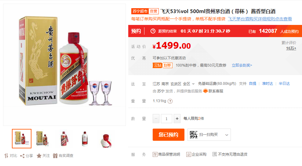 買年貨上蘇寧,買好酒上蘇寧。要說年貨節(jié)期間,蘇寧超市酒水類目的明星產品,還要屬1499元的飛天茅臺酒。年貨節(jié)期間,蘇寧已經啟動了多輪的飛天茅臺酒的預約搶購,而1月10日即將迎來新一輪的搶購。截至1月8日上午10點多,已經有超過14萬實名認證super會員參與了本次預約。