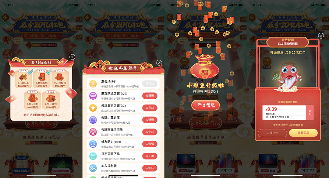 用戶通過做任務、每日簽到、逛品牌店鋪,或者訪問小蘇的農莊、玩賺錢消消樂福利游戲均可獲得福氣值以喂養(yǎng)鯨魚,收集到的福氣值越多,福袋將變得越大,鯨魚升級也越快,可領取的紅包金額也越大。